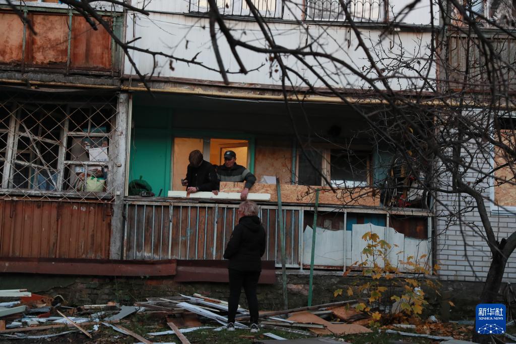 11月14日,在烏克蘭首都基輔市第聶伯區,當地居民對遭受空襲損毀的房屋進行修繕加固。