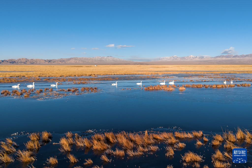 11月14日,大天鵝在甘肅省阿克塞縣小蘇干湖省級候鳥自然保護區(qū)游弋覓食(無人機照片)。