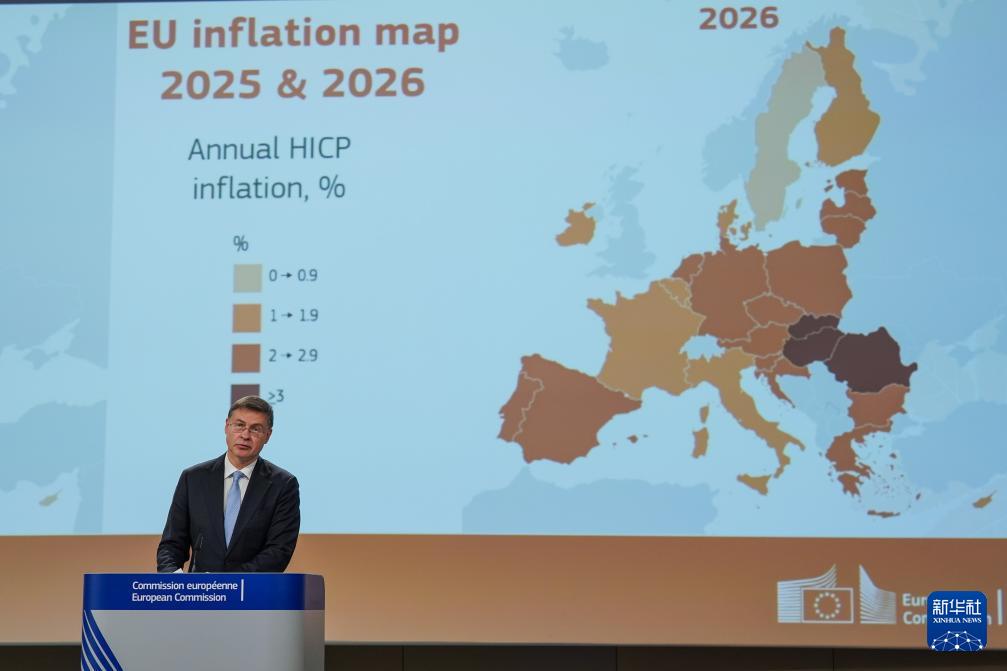 11月17日,歐盟委員會負責經濟事務的委員東布羅夫斯基斯在比利時布魯塞爾發布2025年秋季經濟展望報告。新華社記者 彭子洋 攝