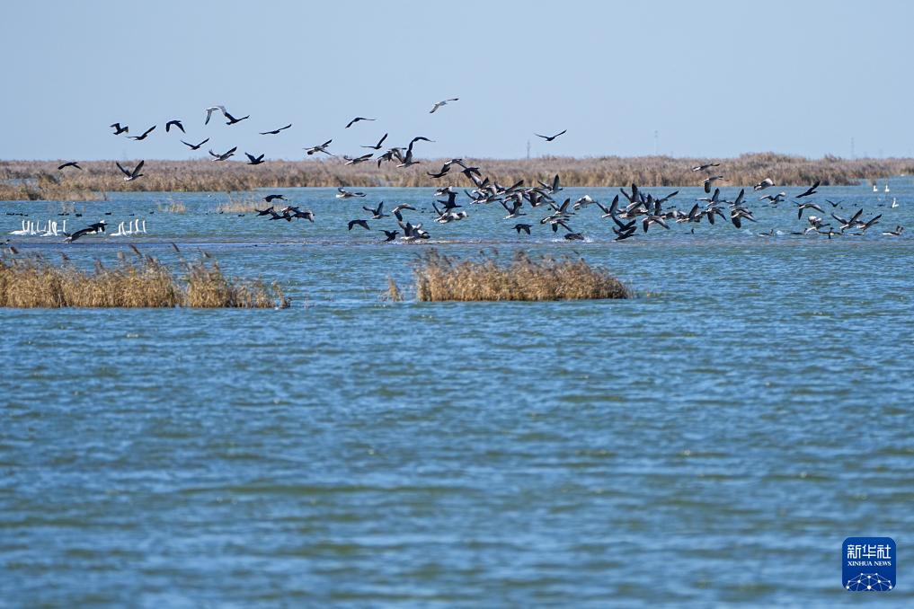 11月13日,山東黃河三角洲國家級自然保護區內,越冬候鳥在飛翔。