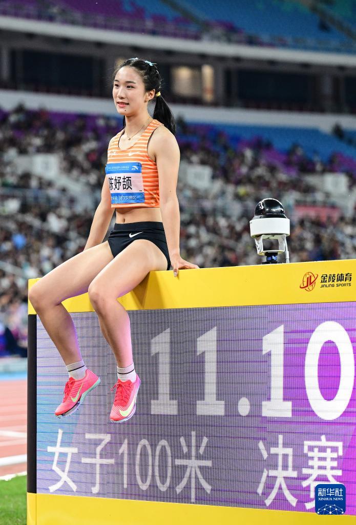11月17日,浙江隊選手陳妤頡在比賽前向觀眾致意。最終她以11秒10的成績奪得冠軍。