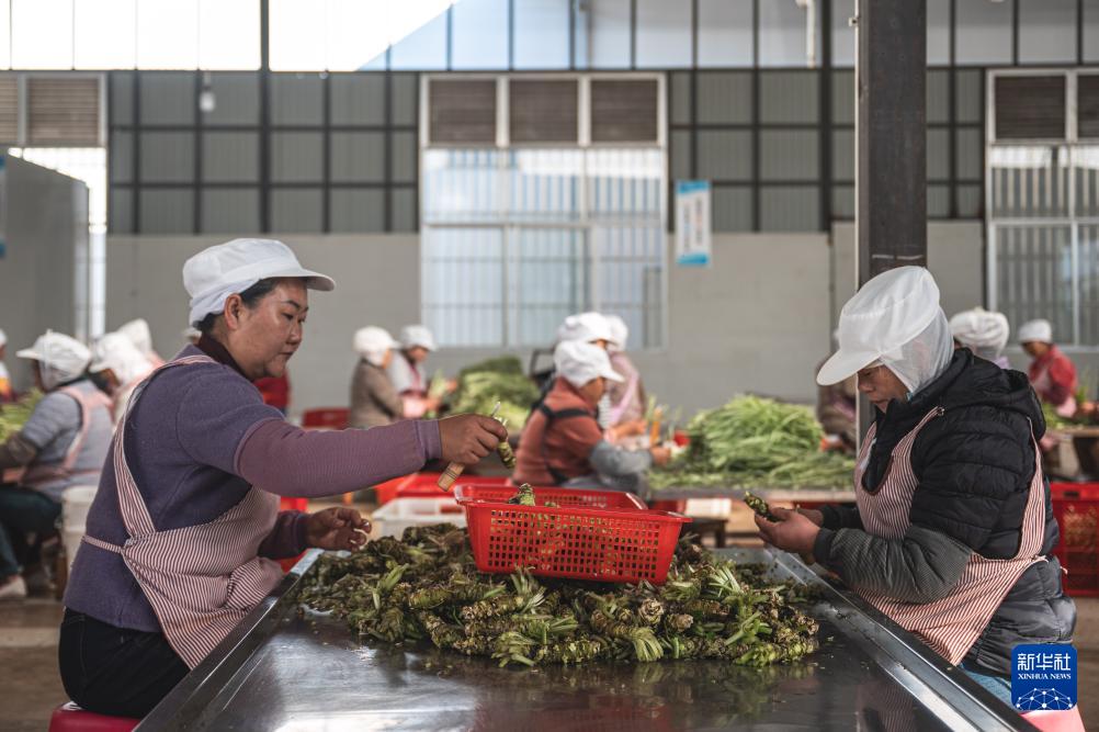 11月18日,工人在云南省保山市隆陽區板橋鎮的保山市山葵實業開發有限責任公司加工車間內初加工山葵葉柄。
