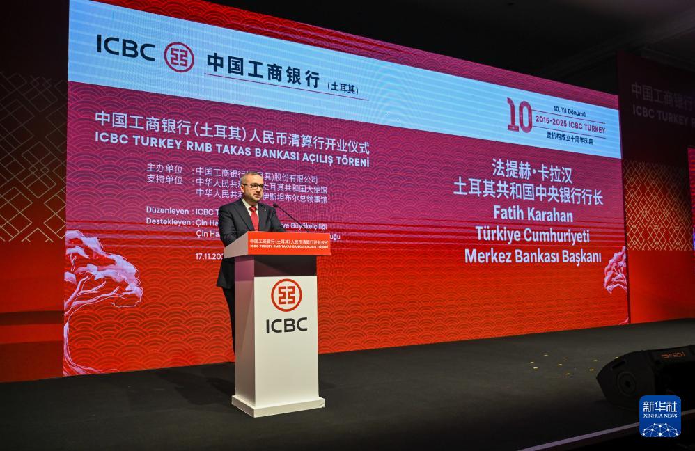 11月17日,土耳其央行行長法提赫·卡拉漢在伊斯坦布爾舉行的中國工商銀行土耳其人民幣清算行開業儀式上致辭。