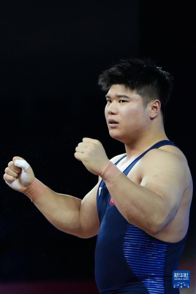 11月19日,遼寧隊選手鄒元清在挺舉比賽中試舉成功后慶祝。最終,他獲得季軍。
