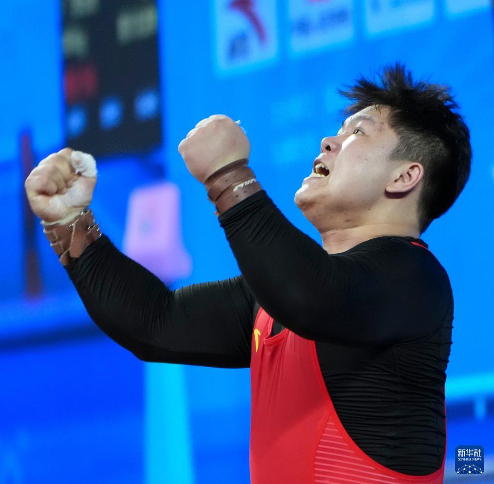 11月19日,天津隊選手劉煥華在抓舉比賽中試舉成功后慶祝。最終,他獲得冠軍。