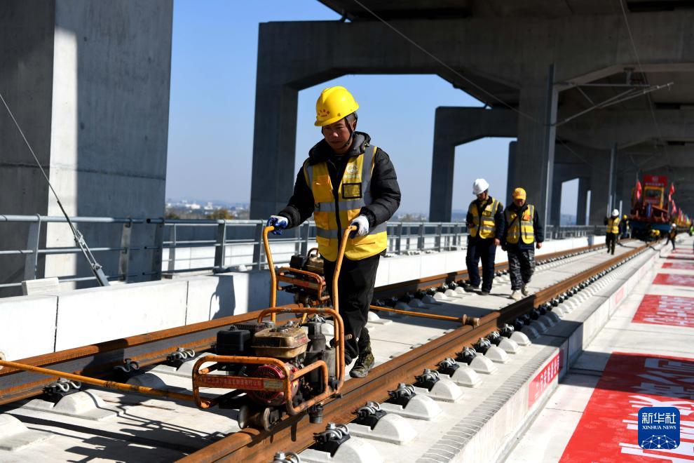 11月20日,中鐵四局施工人員在巢馬城際鐵路鋪軌施工現場作業。
