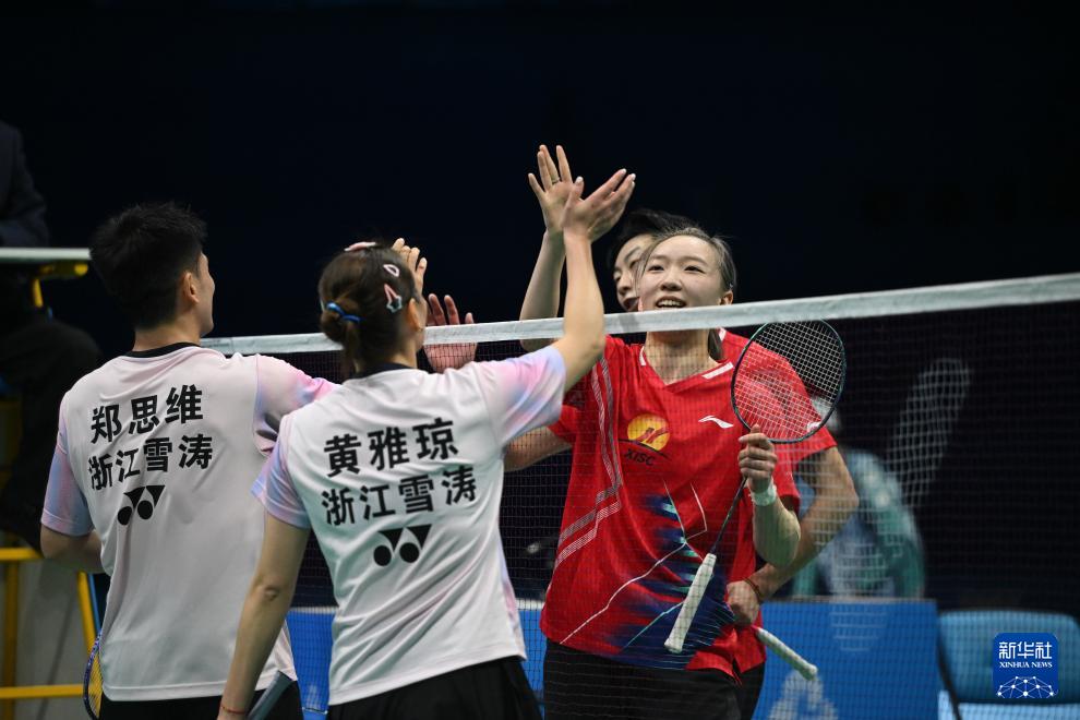11月20日,浙江隊組合鄭思維(左一)/黃雅瓊(左二)和湖南隊組合周志宏/魏雅欣(右一)在賽后擊掌。