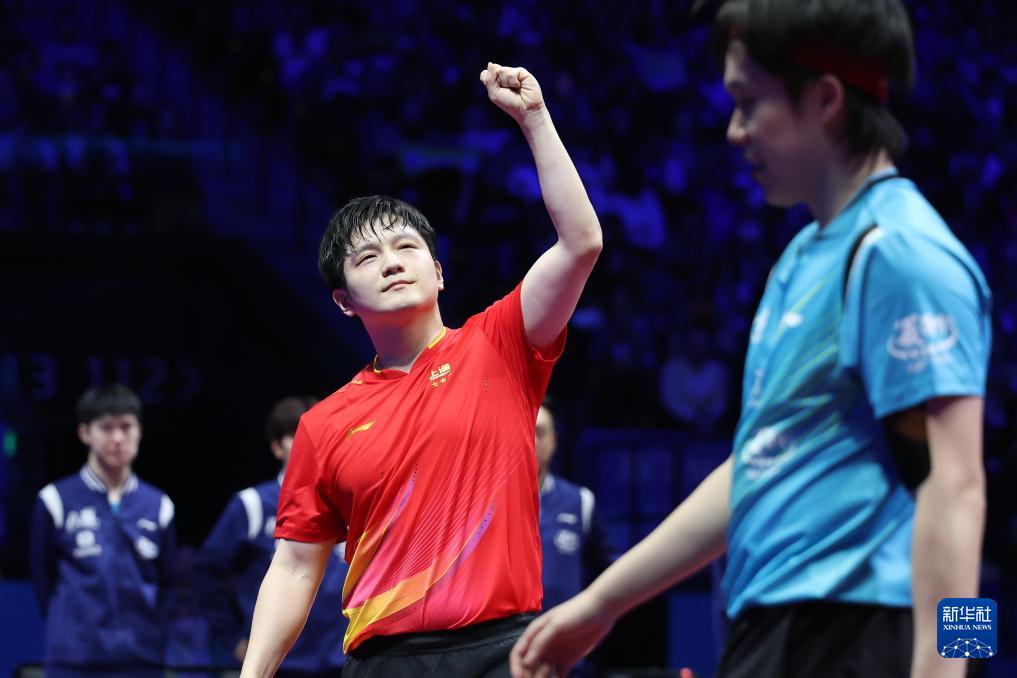 11月20日,上海隊選手樊振東(左)在男單比賽后慶祝勝利。他3比1戰勝北京隊選手王楚欽。