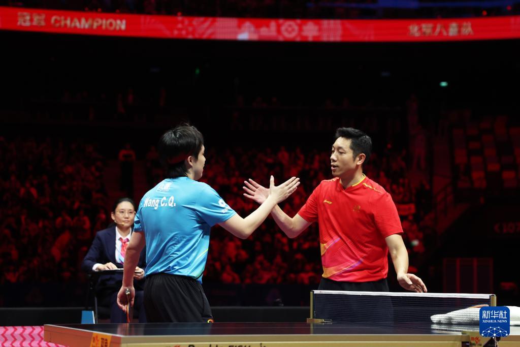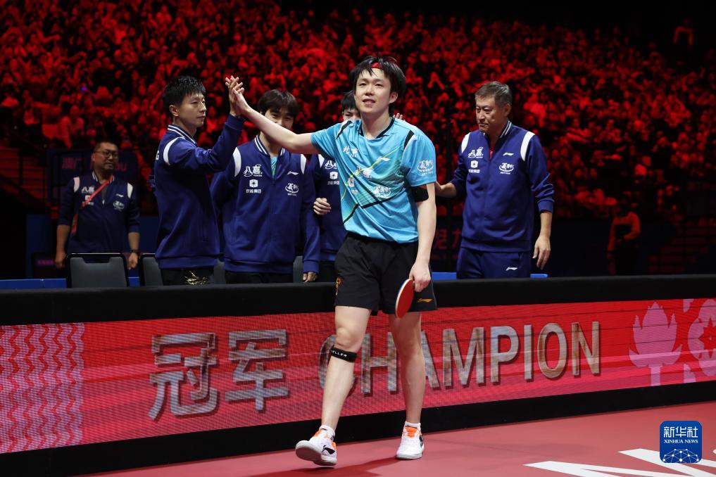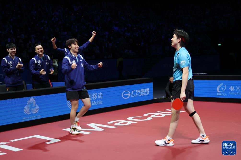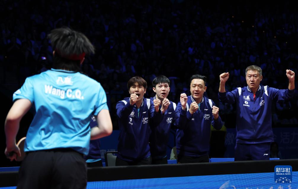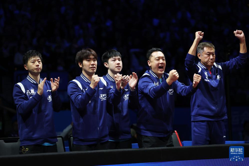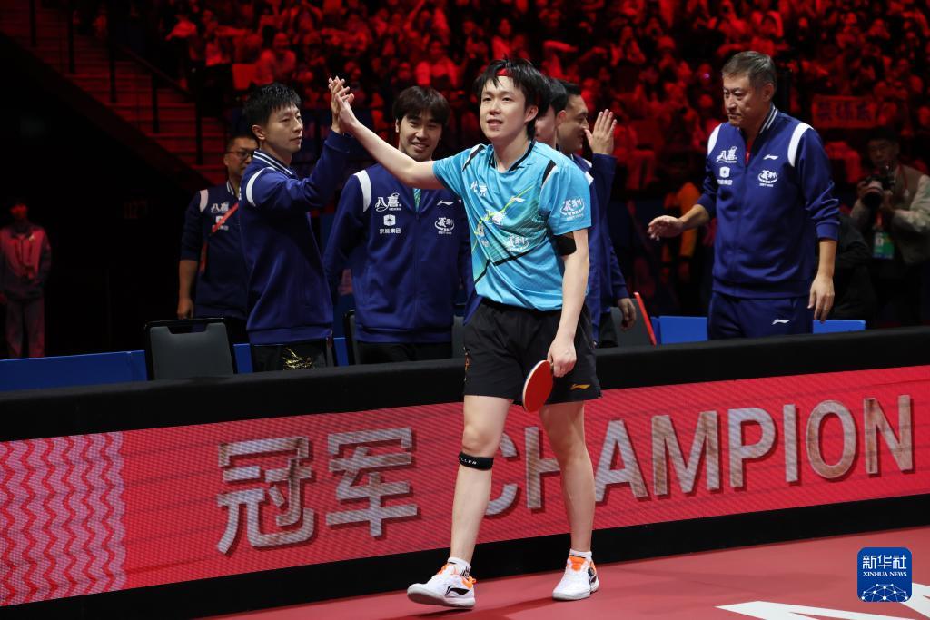 11月20日,北京隊選手王楚欽(右二)在贏得男單比賽后與隊友馬龍(左二)擊掌慶祝。王楚欽3比0戰(zhàn)勝許昕。