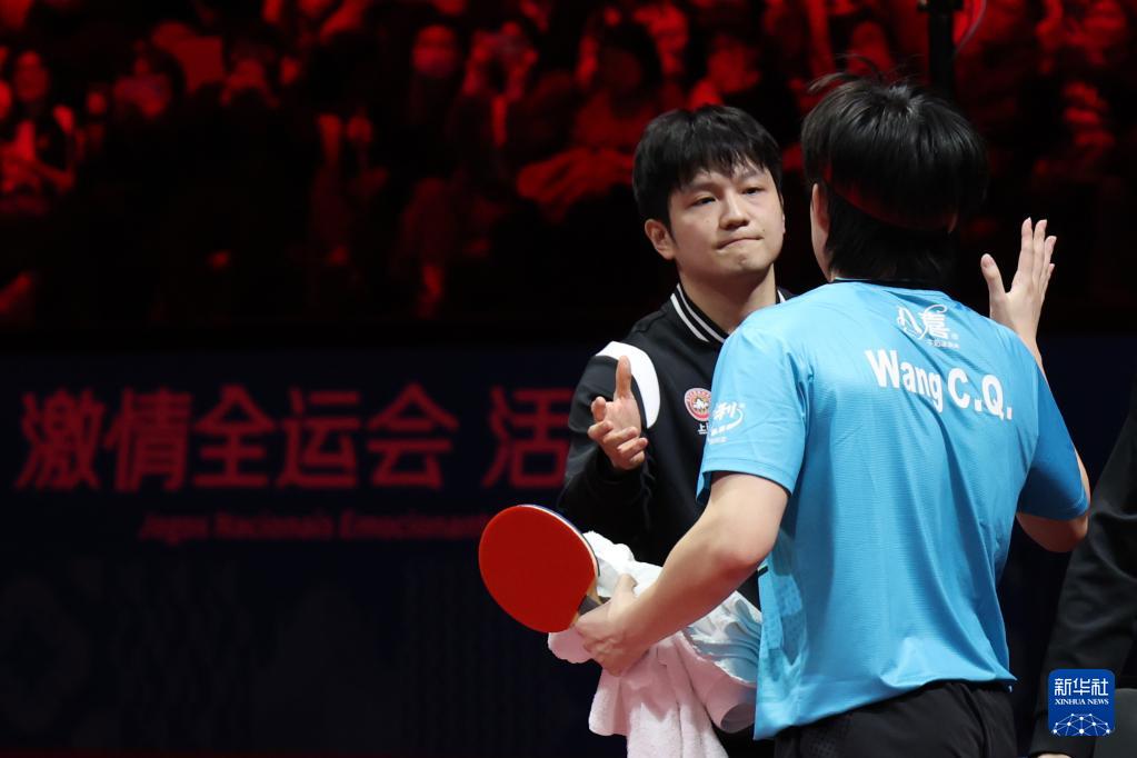 11月20日,北京隊選手王楚欽(左)和上海隊選手許昕(右)在男單比賽后握手致意。王楚欽3比0戰(zhàn)勝許昕。