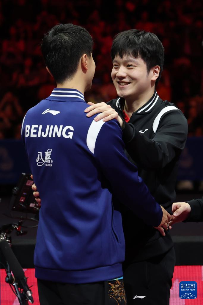11月20日,北京隊選手王楚欽(左)和上海隊選手樊振東在比賽后擁抱。