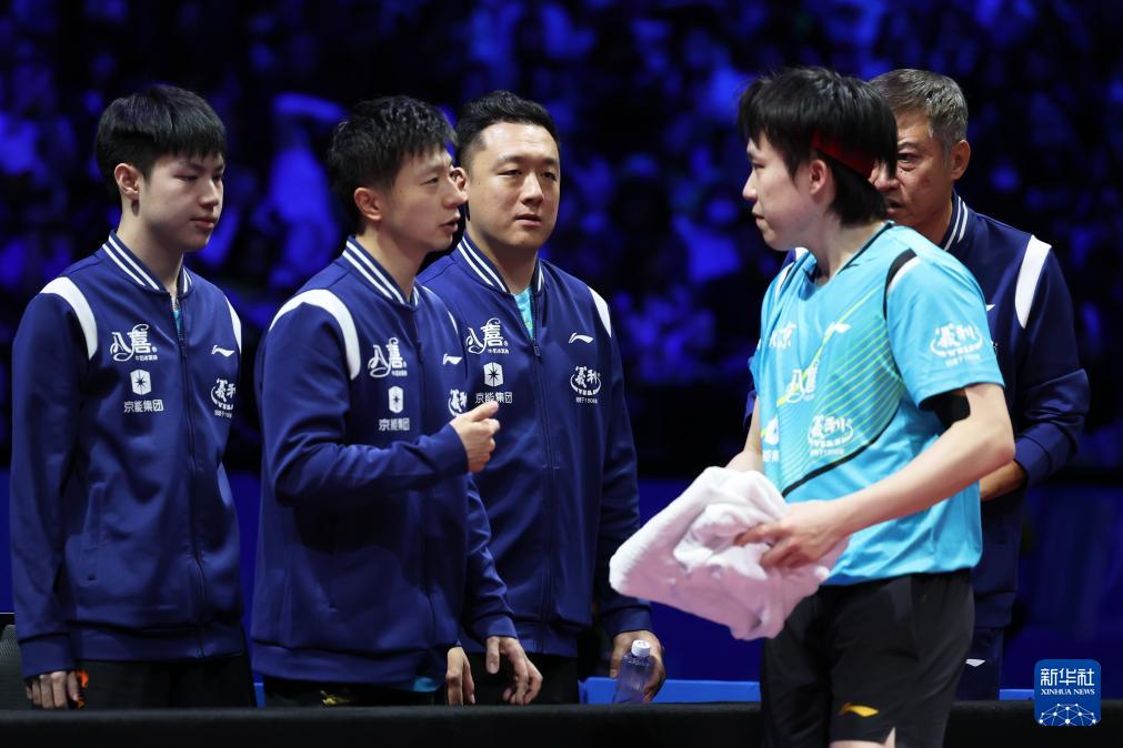 11月20日,北京隊選手王楚欽(右二)在男單比賽間隙與隊友馬龍(左二)交流。王楚欽3比0戰(zhàn)勝上海隊選手許昕。