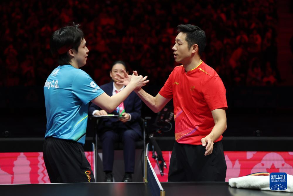11月20日,北京隊選手馬龍(左一)和上海隊選手許昕在比賽后握手致意。