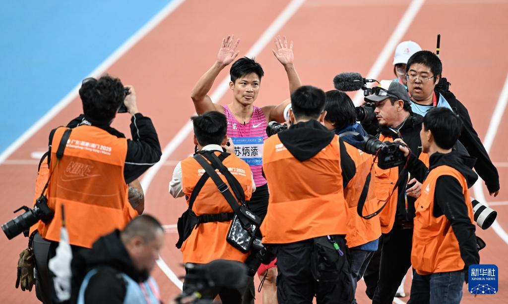 11月20日,廣東隊選手蘇炳添(中)在比賽后向觀眾致意。