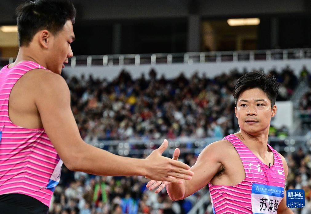 11月20日,廣東隊選手蘇炳添(右)在比賽前。