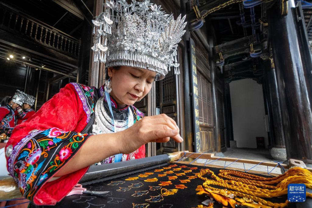 11月23日,重慶酉州苗繡市級傳承人陳國桃在2025非遺品牌推廣周上刺繡。