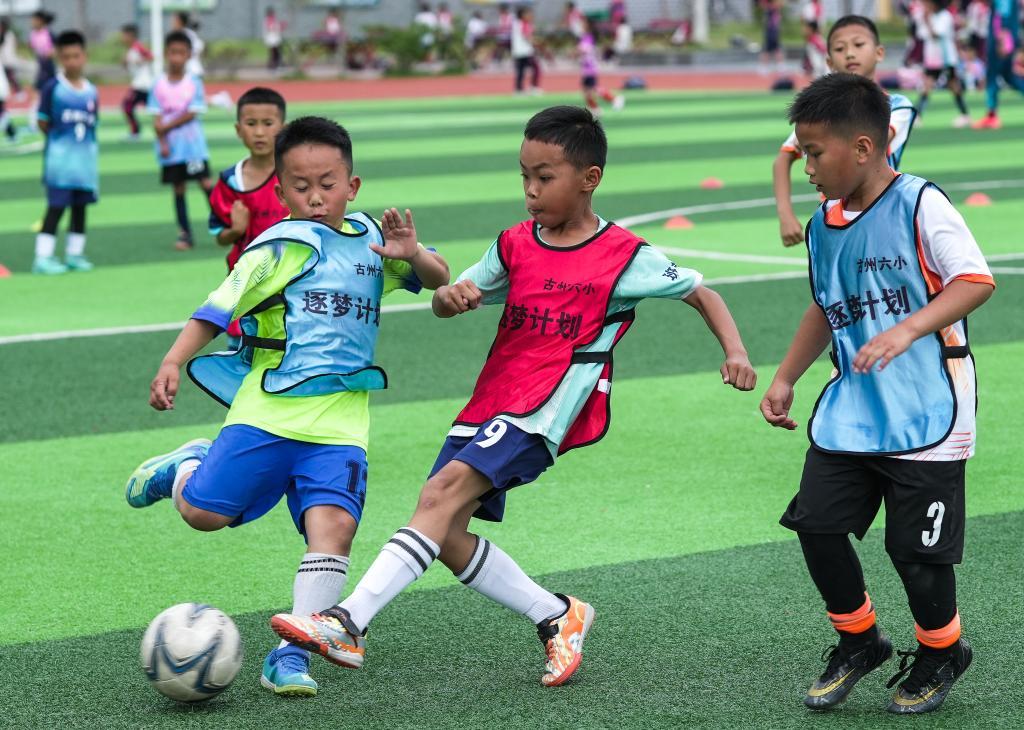 4月25日,在貴州省榕江縣古州鎮第六小學,學生們在“班超”足球賽中拼搶。新華社發(王炳真 攝)