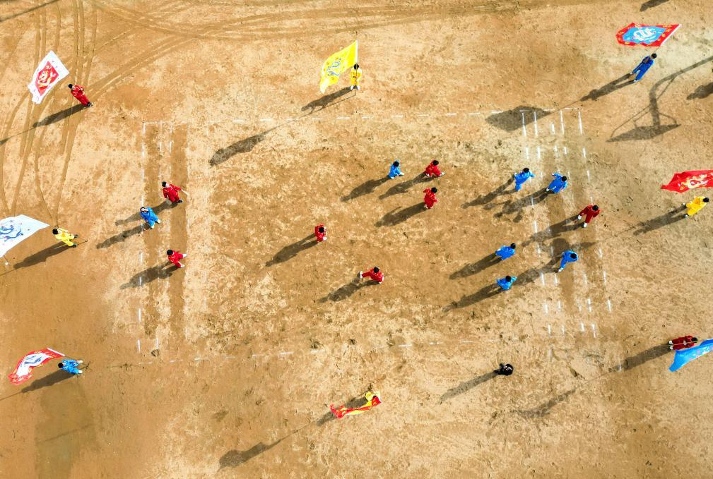 9月16日,吉林省吉林市烏拉街滿族中學學生在操場進行珍珠球比賽(無人機照片)。新華社記者 顏麟蘊 攝