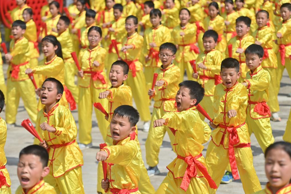 5月13日,學生在廣西蒙山縣文圩鎮文圩中心小學練習功夫扇。新華社記者 黃孝邦 攝
