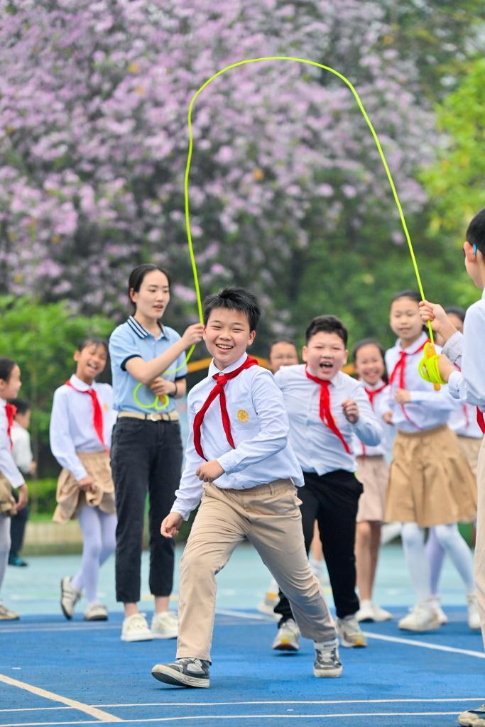 4月10日,廣西柳州市潭中路第二小學的學生們在大課間跳繩。新華社記者 黃孝邦 攝