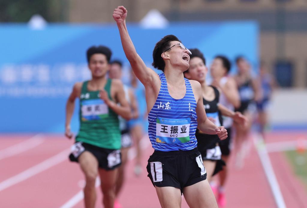 2023年11月13日,山東選手王振業在第一屆全國學生(青年)運動會田徑項目中學組男子1500米決賽中沖過終點。新華社記者 吳梓溢 攝