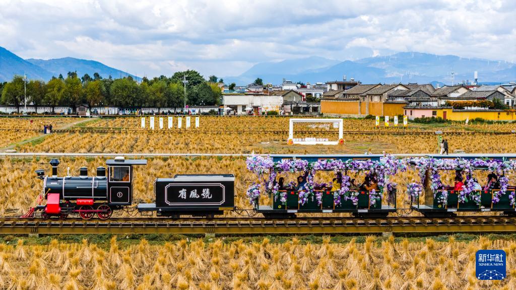 游客在喜洲古鎮乘坐觀光小火車(11月24日攝,無人機照片)。