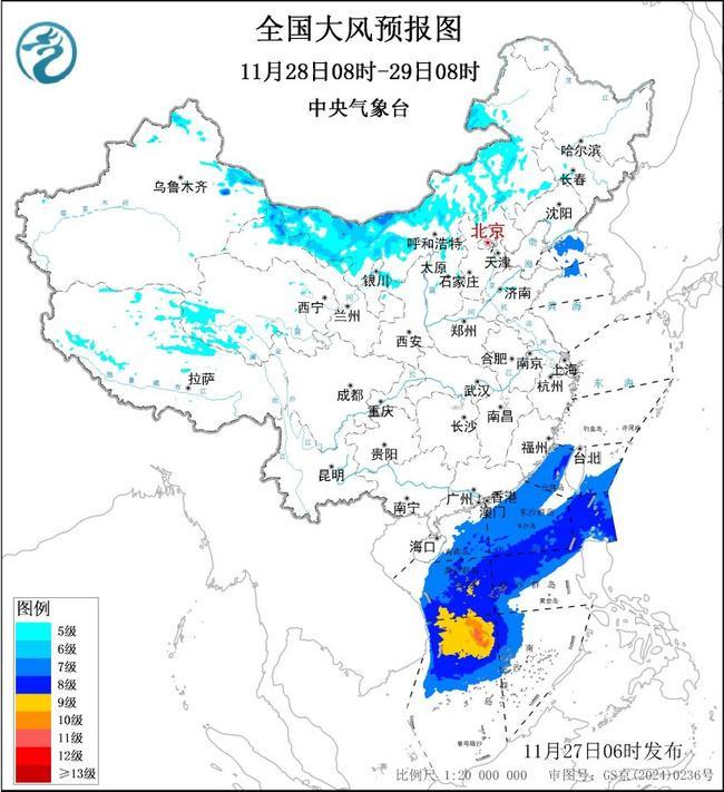 11月28日08時至29日08時,新疆北部和東部、內蒙古大部、甘肅北部、寧夏北部、山西北部以及青海南部、西藏北部等地有5~6級大風,陣風7~8級,其中新疆東部山口地區、內蒙古中西部部分地區風力可達7級,陣風8~9級;11月28日08時至29日08時巴士海峽、南海東北部和中部海域將有8級、陣風9級的東北風,其中南海西南部海域的風力可達9級、陣風10級。