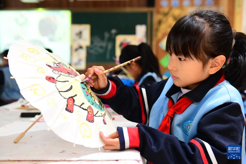 11月25日,在濟南市市中區愛都小學,來自市中區藝術教育基地的徐子芯老師教學生們做漆扇。