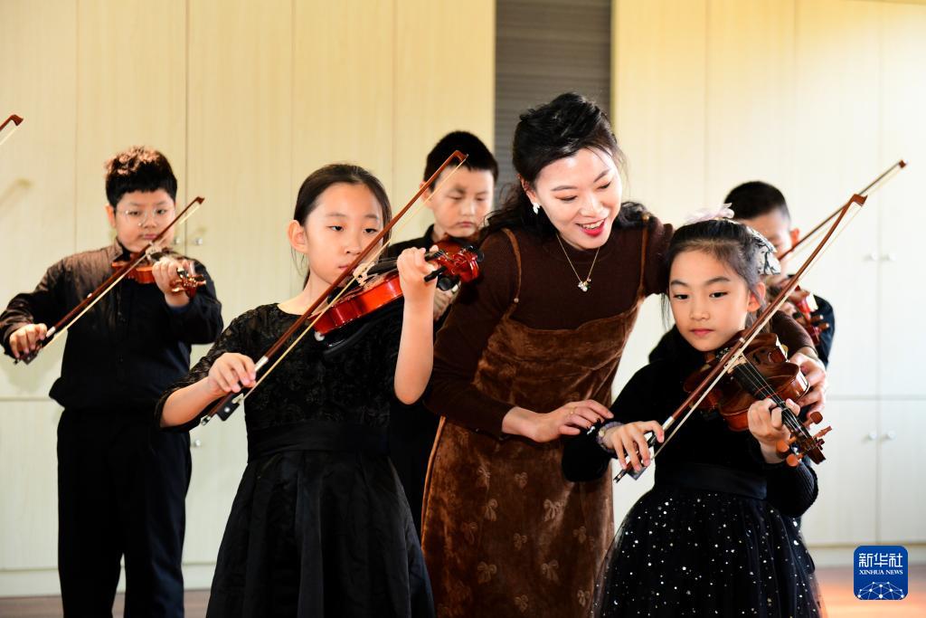 11月26日,在濟南市市中區泉海小學,音樂老師夏霄霏在指導學生拉小提琴。