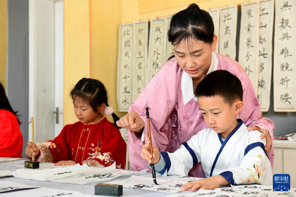 11月26日,在濟南市市中區泉海小學,書法老師王云鑫在指導學生練習書法。