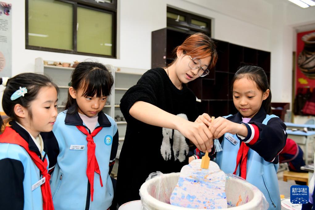 11月26日,在濟南市市中區泉海小學,美術老師孫鑫在指導學生畫畫。