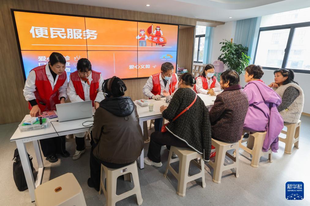 11月27日,在孝順鎮府東社區的黨群服務中心,志愿者給社區老年人測量血壓。