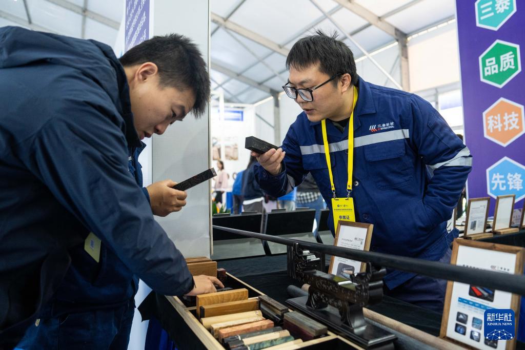 11月27日,在婁底經開區電力科技谷,參展商(右)在介紹木基復合材料。