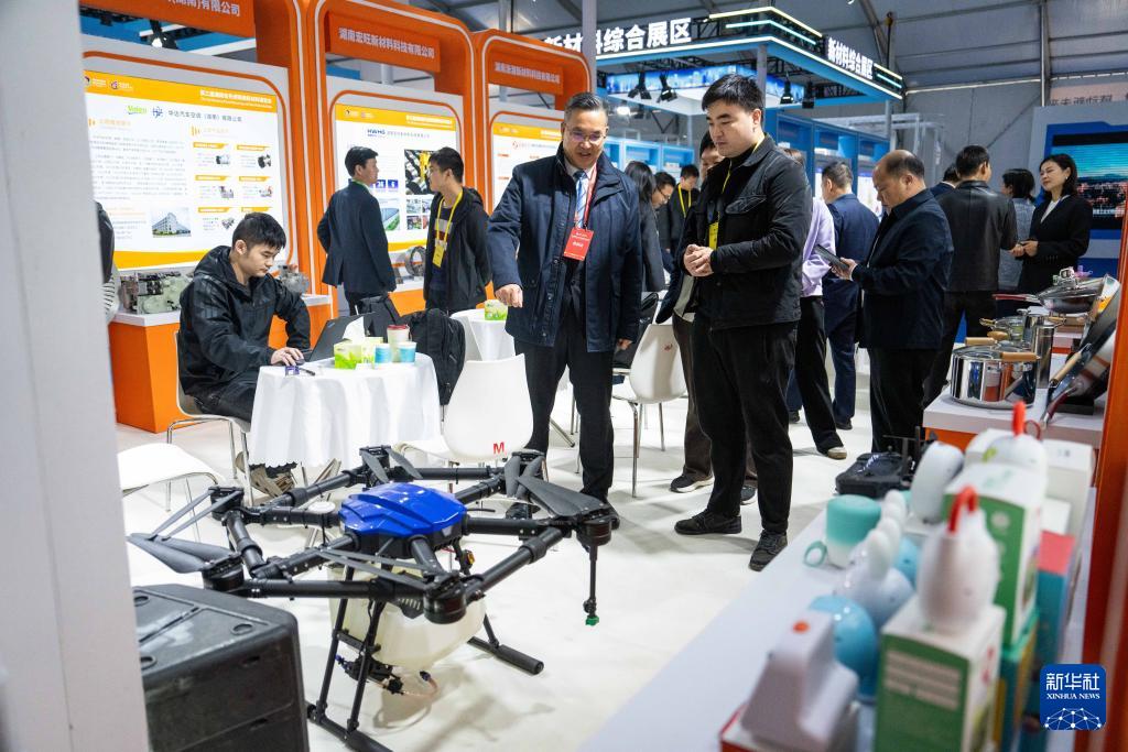 11月27日,在婁底經開區電力科技谷,參觀者(中)在了解一款農用無人機。