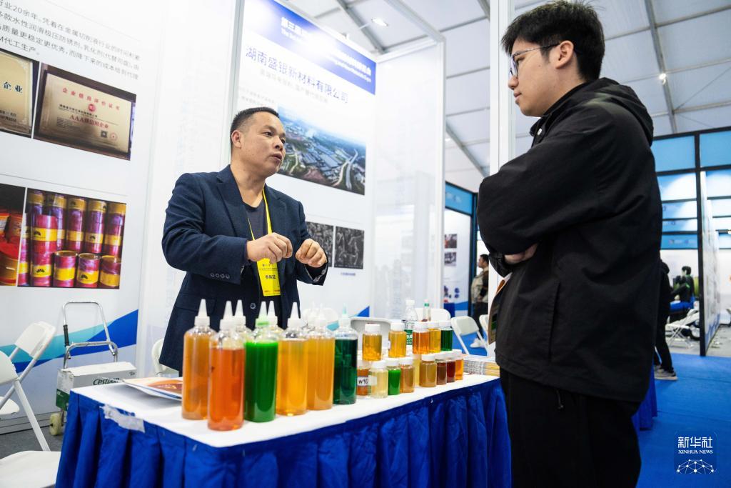 11月27日,在婁底經開區電力科技谷,參展商(左)在介紹金屬切削液。