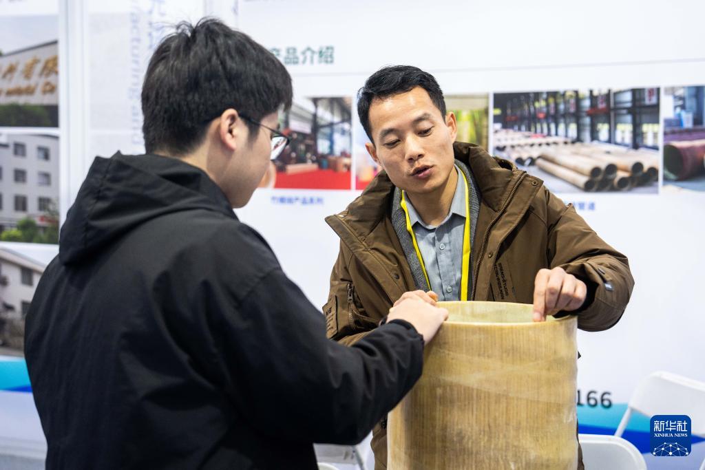11月27日,在婁底經開區電力科技谷,參展商(右)在介紹竹纏繞復合材料。