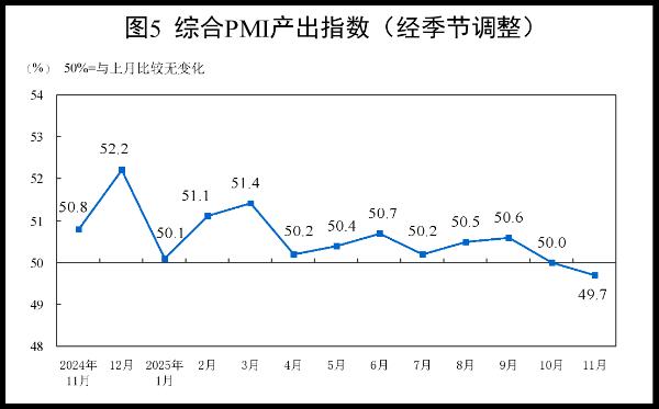 11月份,綜合PMI產(chǎn)出指數(shù)為49.7%,比上月下降0.3個(gè)百分點(diǎn)。