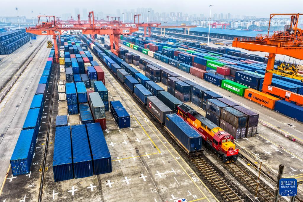 11月30日,重慶—匈牙利布達(dá)佩斯全程時(shí)刻表中歐班列在重慶團(tuán)結(jié)村中心站等待發(fā)車(無人機(jī)照片)。