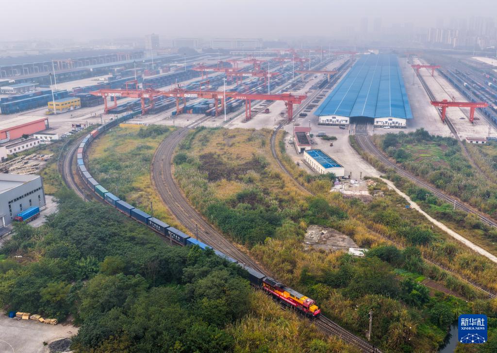 11月30日,重慶—匈牙利布達(dá)佩斯全程時(shí)刻表中歐班列在重慶團(tuán)結(jié)村中心站順利發(fā)車(無人機(jī)照片)。