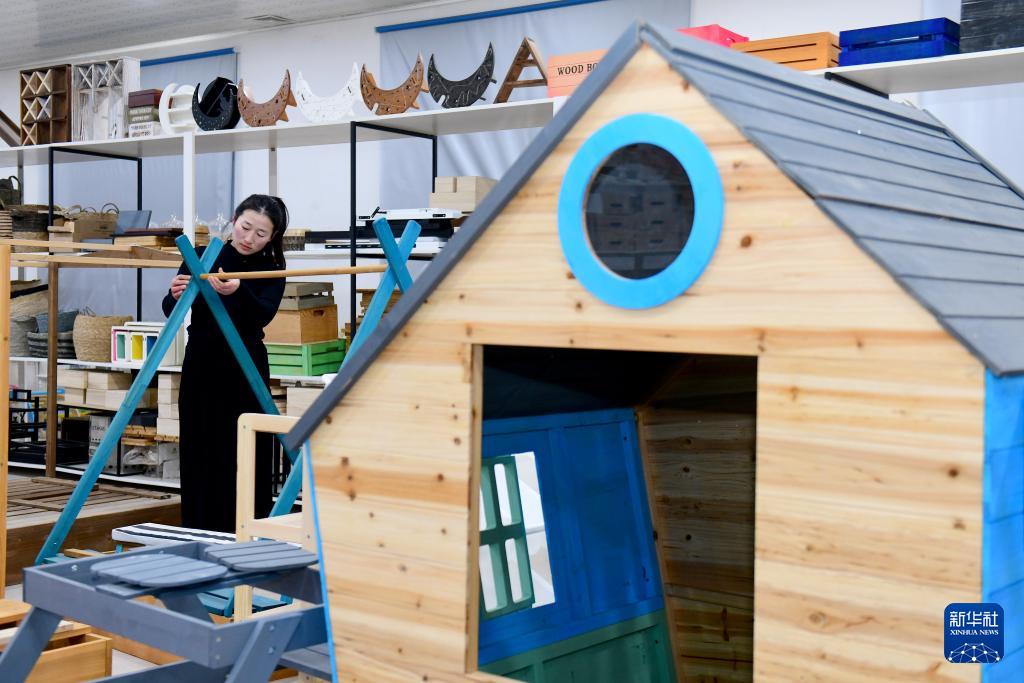 11月28日,在曹縣鵬輝工藝品有限公司,工作人員在展廳組裝寵物家居。
