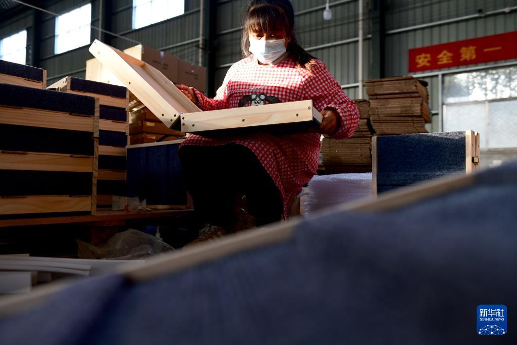 11月28日,在曹縣海納木制工藝品有限公司,工作人員包裝寵物家居產(chǎn)品。