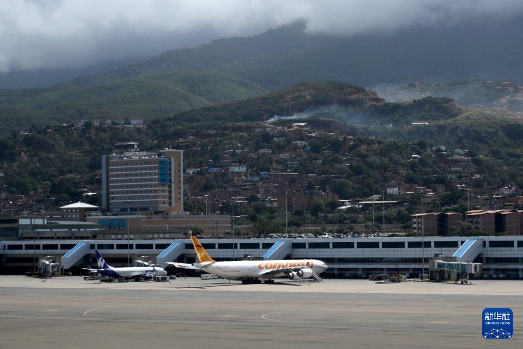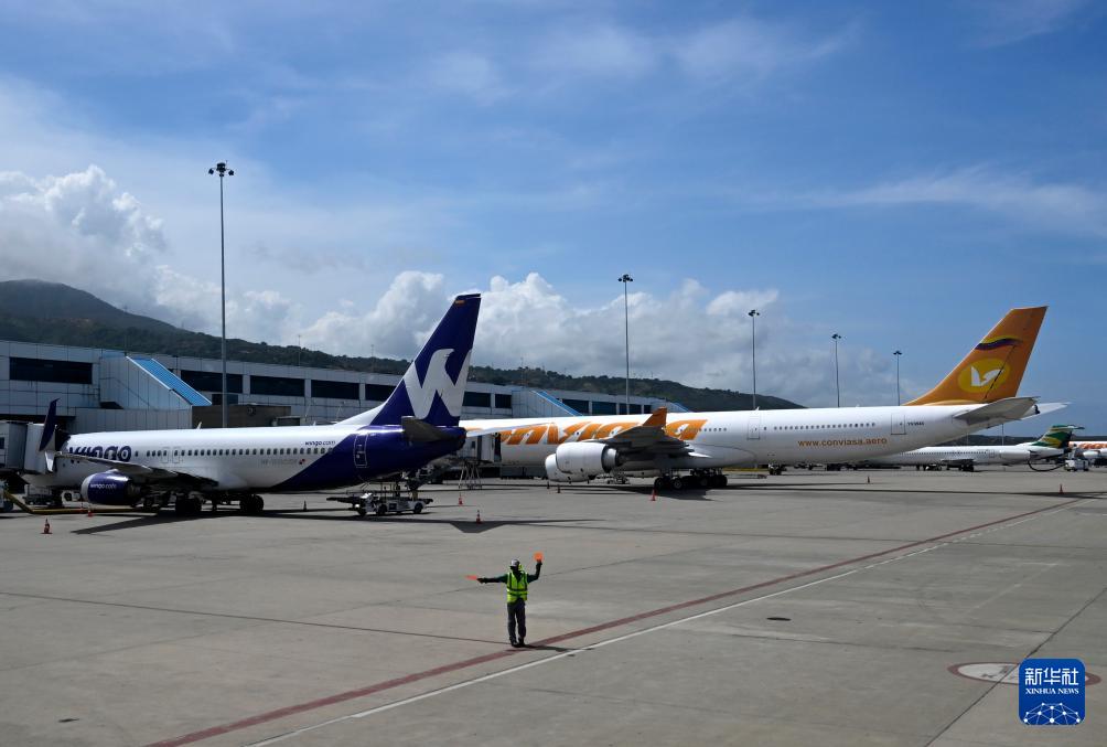 12月1日,在委內瑞拉首都加拉加斯附近的邁克蒂亞西蒙·玻利瓦爾國際機場,地勤人員引導客機進入停機坪。