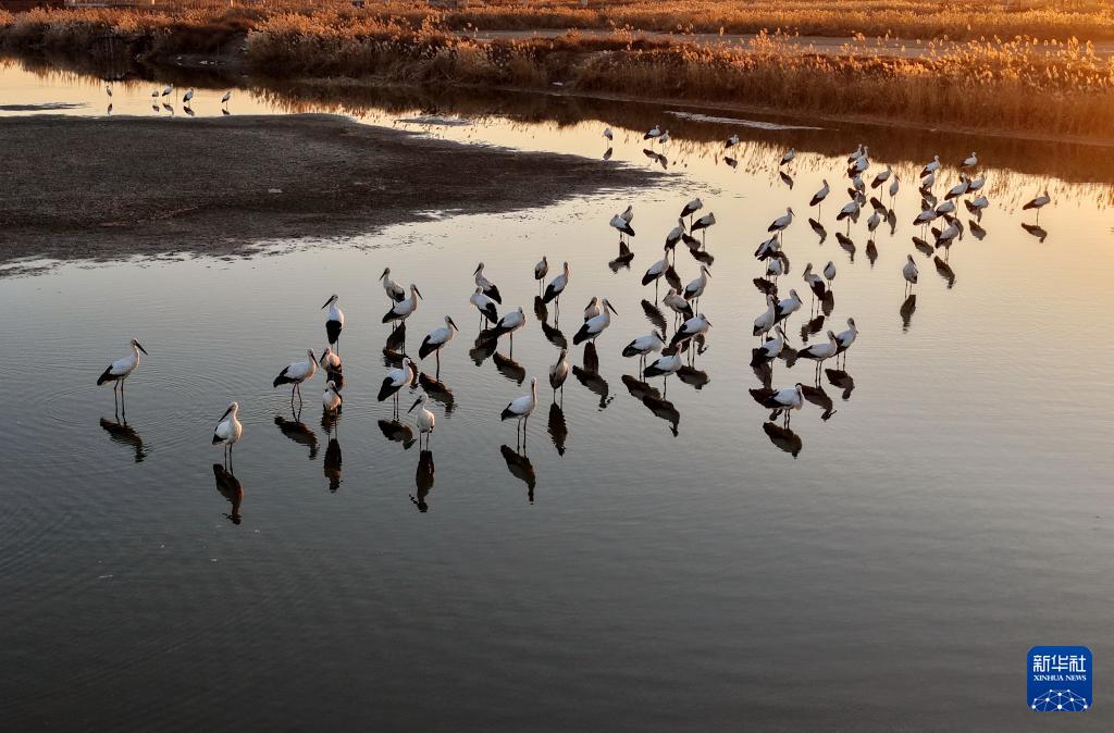 11月30日,東方白鸛在河北省唐山市豐南區(qū)沿海濕地水面上覓食(無人機(jī)照片)。