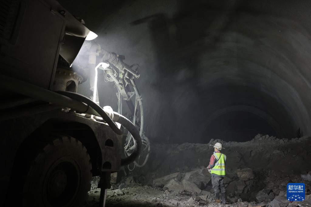 12月2日,中鐵二十局的施工人員在蘭永臨高速公路辛家隧道內進行噴漿作業。