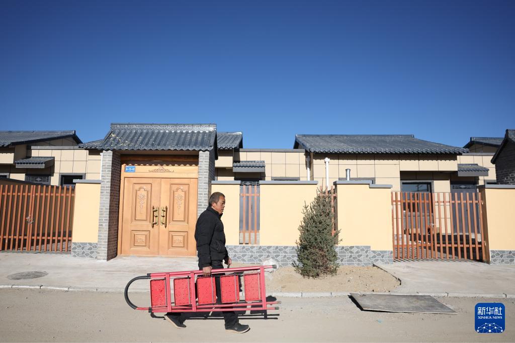 12月1日,在榆中縣馬坡鄉舊莊溝村安置點,村民王利軍提著梯子從新家門前的路上走過。