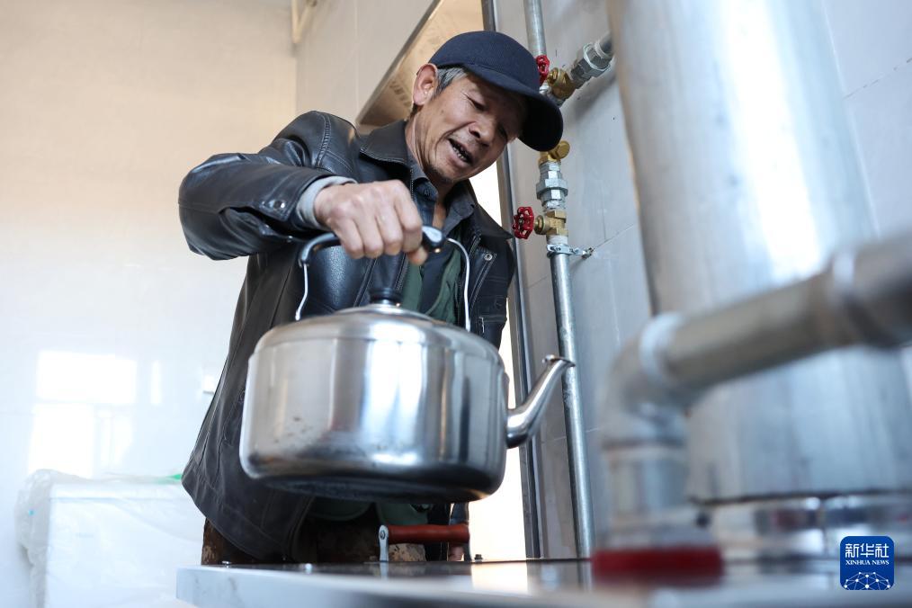 12月1日,在榆中縣馬坡鄉舊莊溝村安置點,村民王建武在新家燒水。