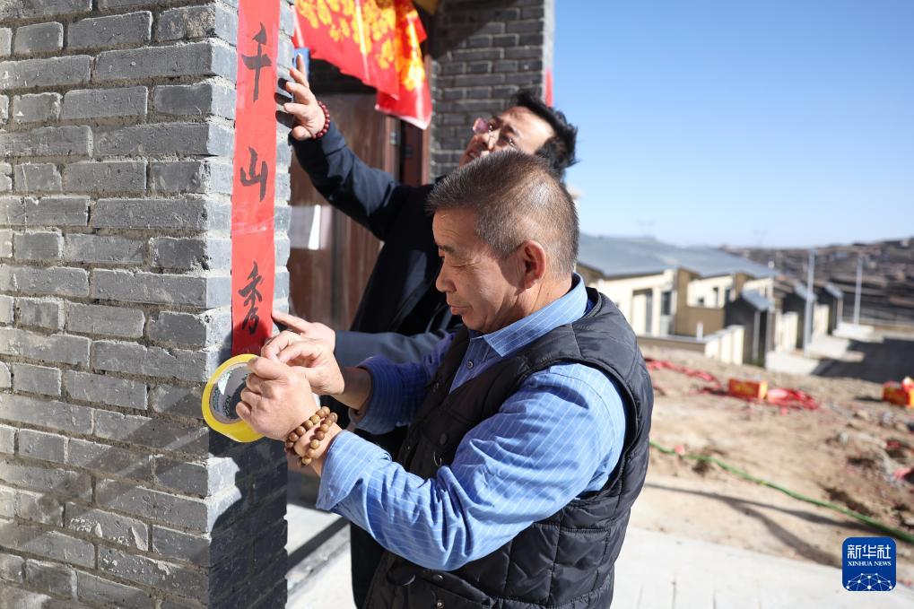12月1日,在榆中縣馬坡鄉馬蓮灘村集中安置點,村民張爭琦(前)在給新家的大門貼對聯。