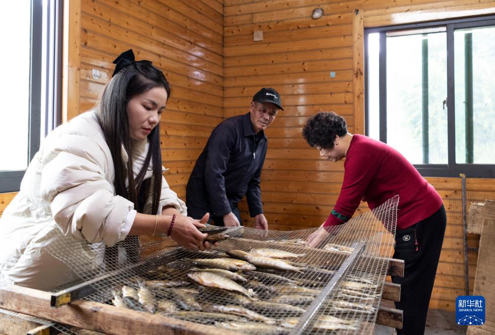 12月3日,赤溪村村民(右一)在向游客展示他養(yǎng)殖的中華倒刺鲃。