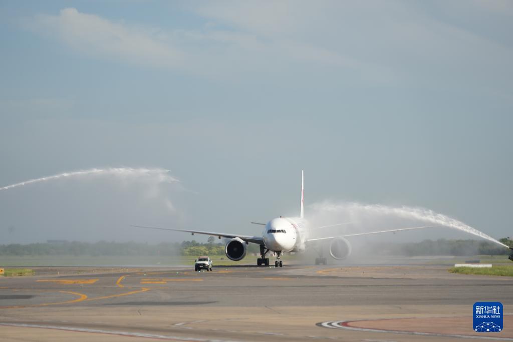 中國東方航空公司MU745航班4日抵達阿根廷首都布宜諾斯艾利斯的埃塞薩國際機場,緩緩穿過象征民航最高禮儀的“水門”。這標志著中阿兩國之間首條直航航線開通。