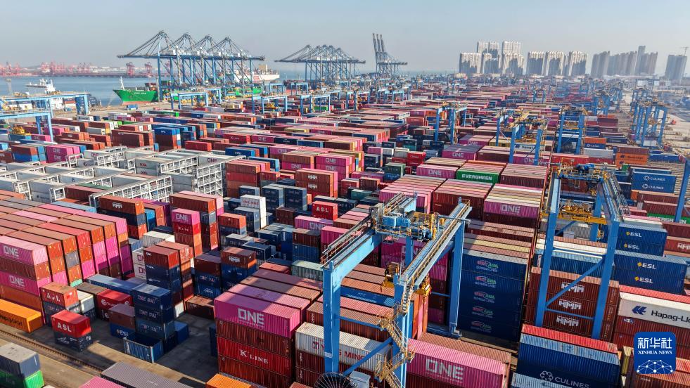 12月4日在青島港前灣港區拍攝的等待轉運的集裝箱(無人機照片)。